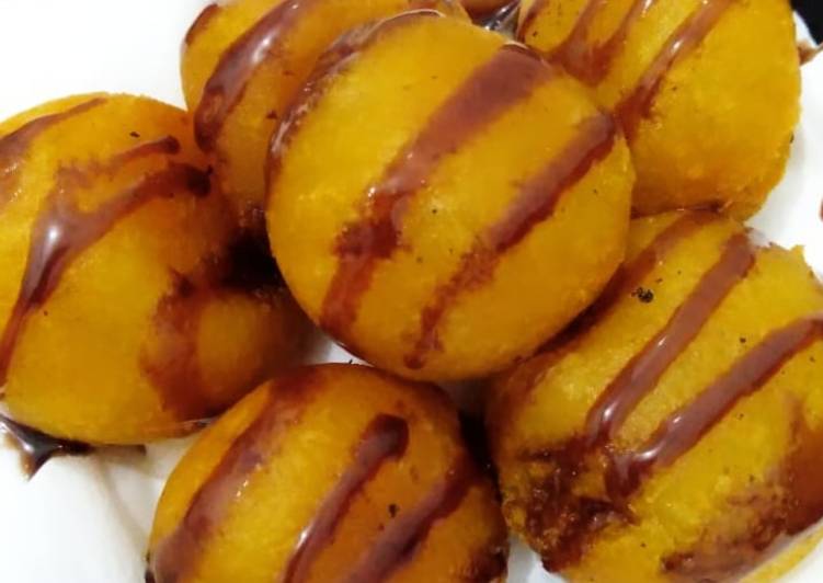 - Goreng hingga kecokelatan dan jika sudah matang, angkat lalu tiriskan. Beri hiasan pakai skm cokelat di atasnya. Bola bola ubi siap untuk dinikmati. Selamat mencoba! :).