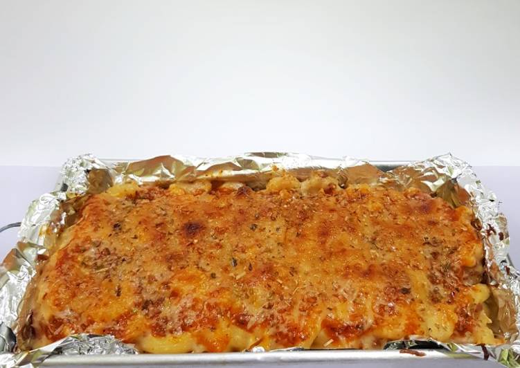 - Tuang makaroni ke dalam loyang lalu beri saus bolognese dan parutan keju serta oregano..