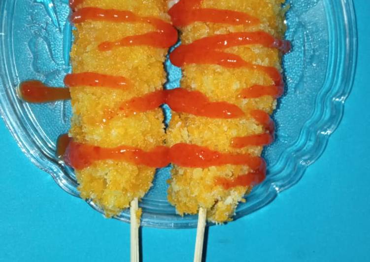 - Panaskan minyak goreng, lalu masukkan corndog tadi dan goreng sampai matang atau coklat keemasan.