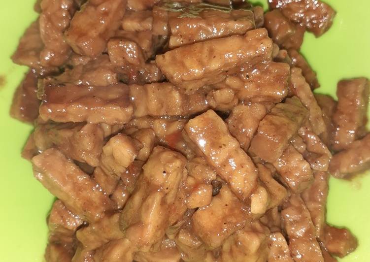 - Masukan tempe yang sudah digoreng lalu aduk hingga semua bagian tercampur rata.